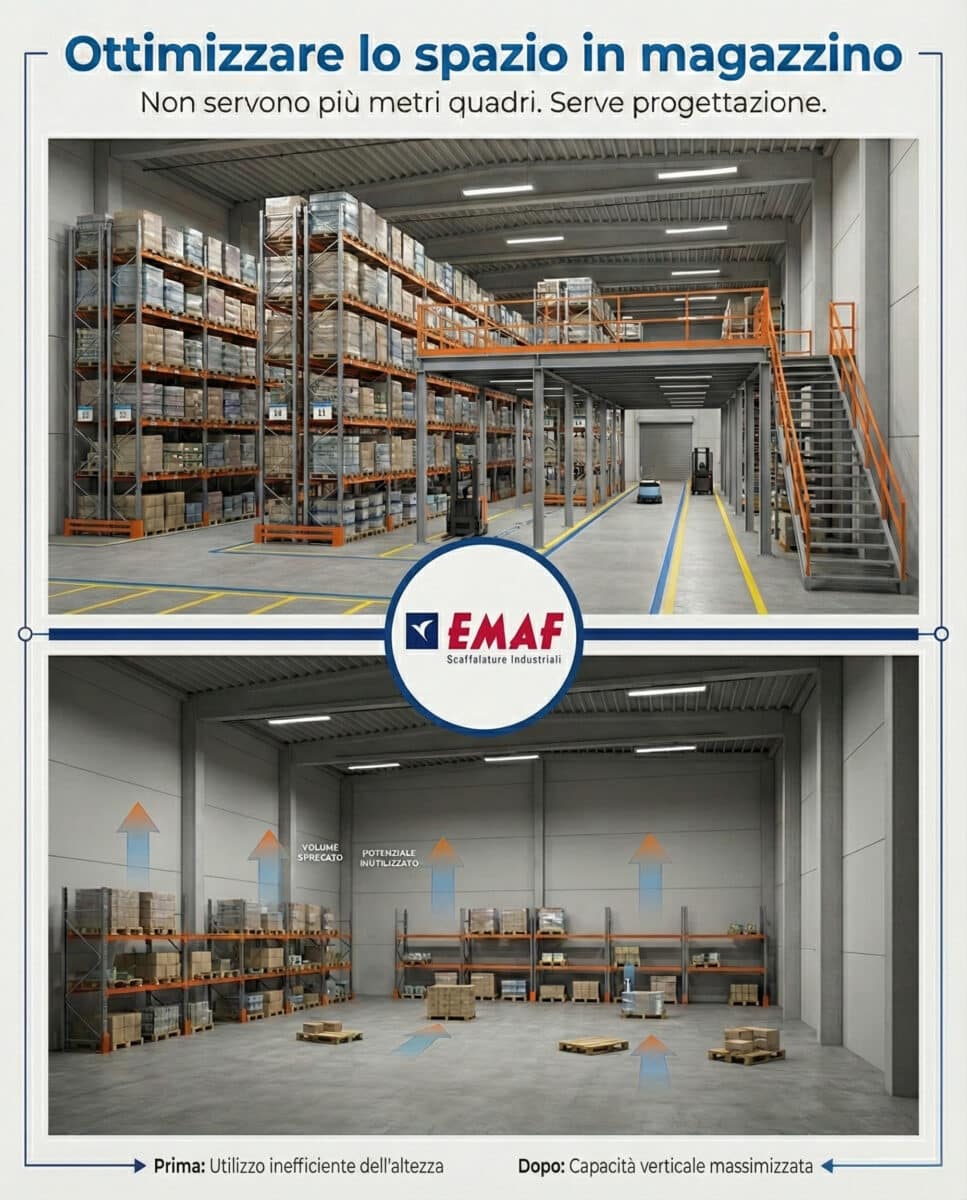 Se stai valutando come migliorare l’organizzazione del tuo magazzino, EMAF supporta le aziende in tutte le fasi, dalla progettazione del layout alla fornitura e installazione di scaffalature industriali e soppalchi su misura.