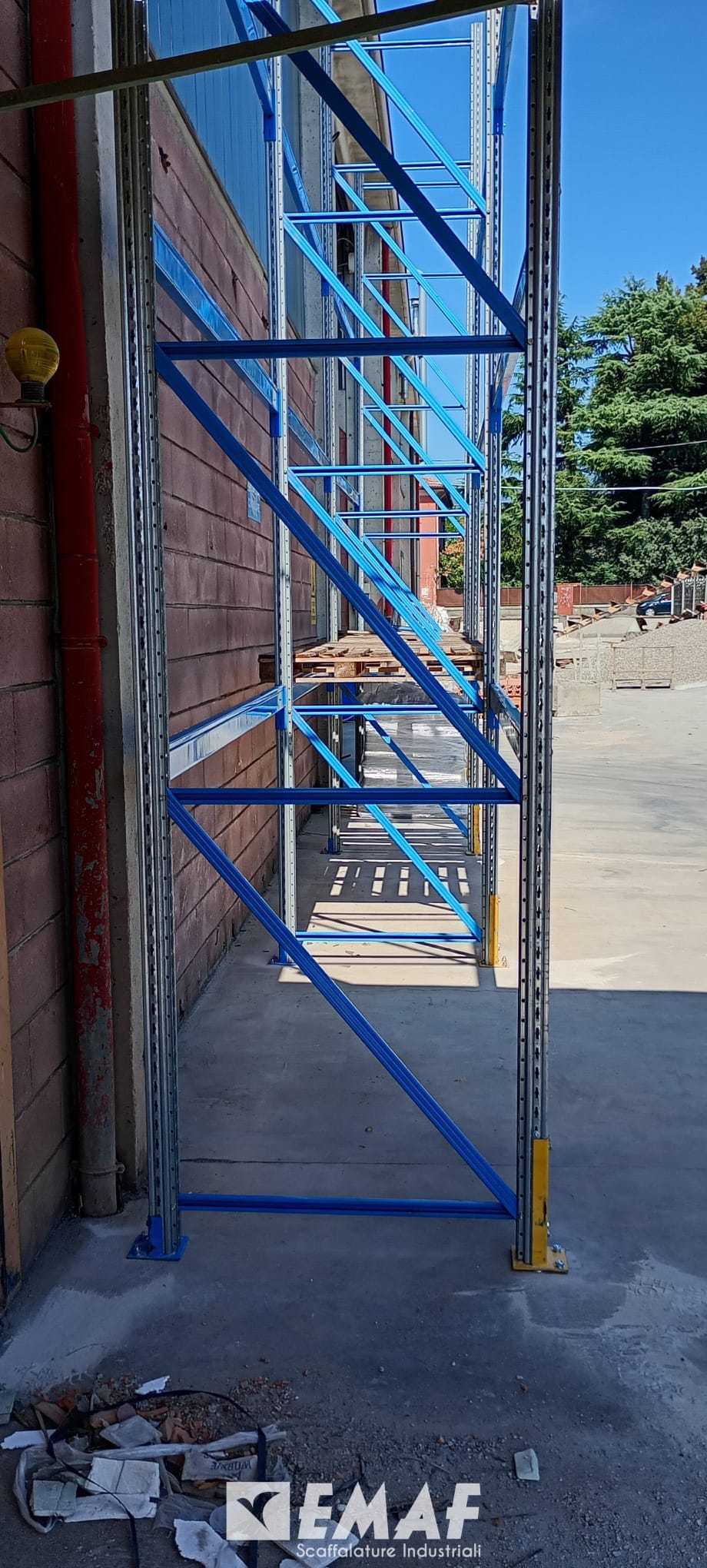L’installazione ha previsto l’impiego di 8 spalle alte 5 metri e di 36 correnti da 2,7 metri, configurati in 2 file da 3 campate ciascuna. La struttura è stata realizzata con 3 livelli di carico più terra, per garantire massima efficienza e organizzazione degli spazi di magazzino.