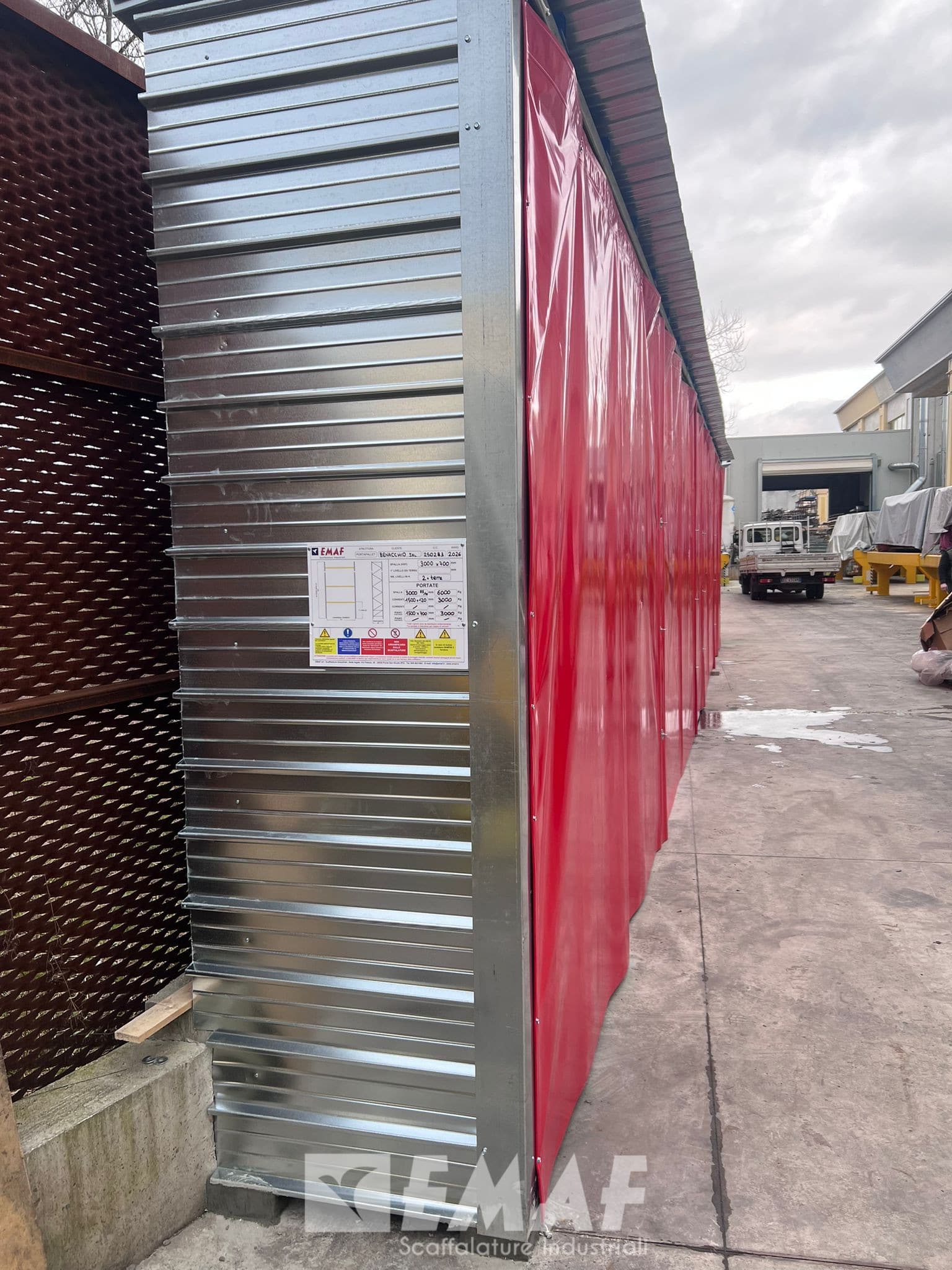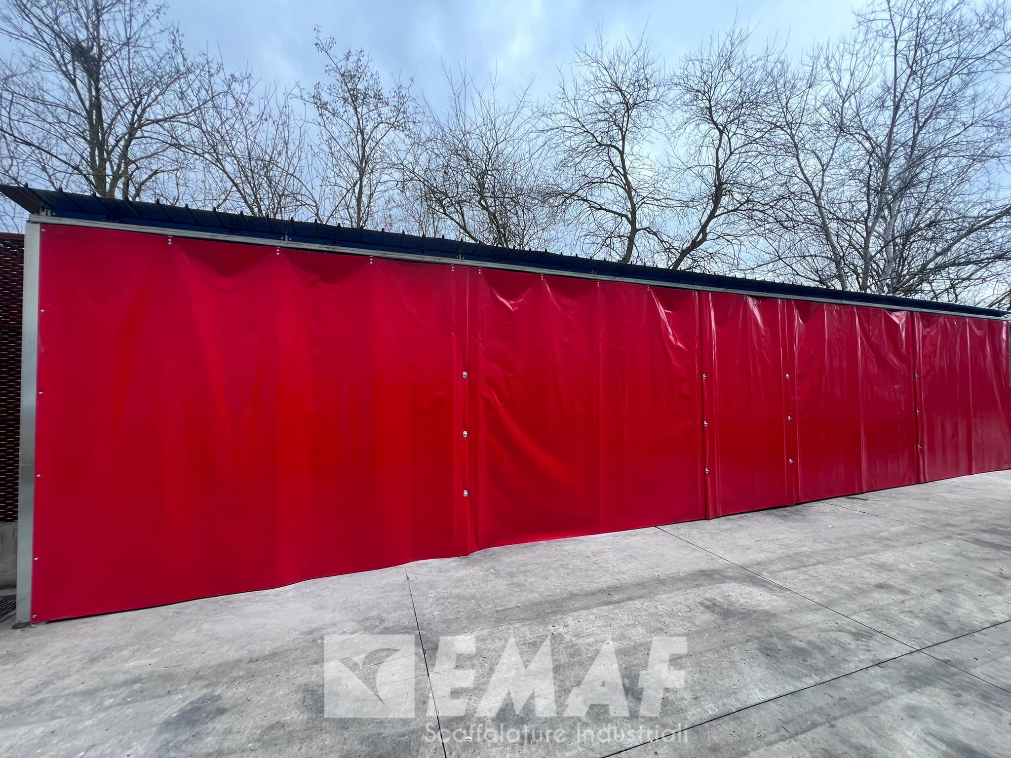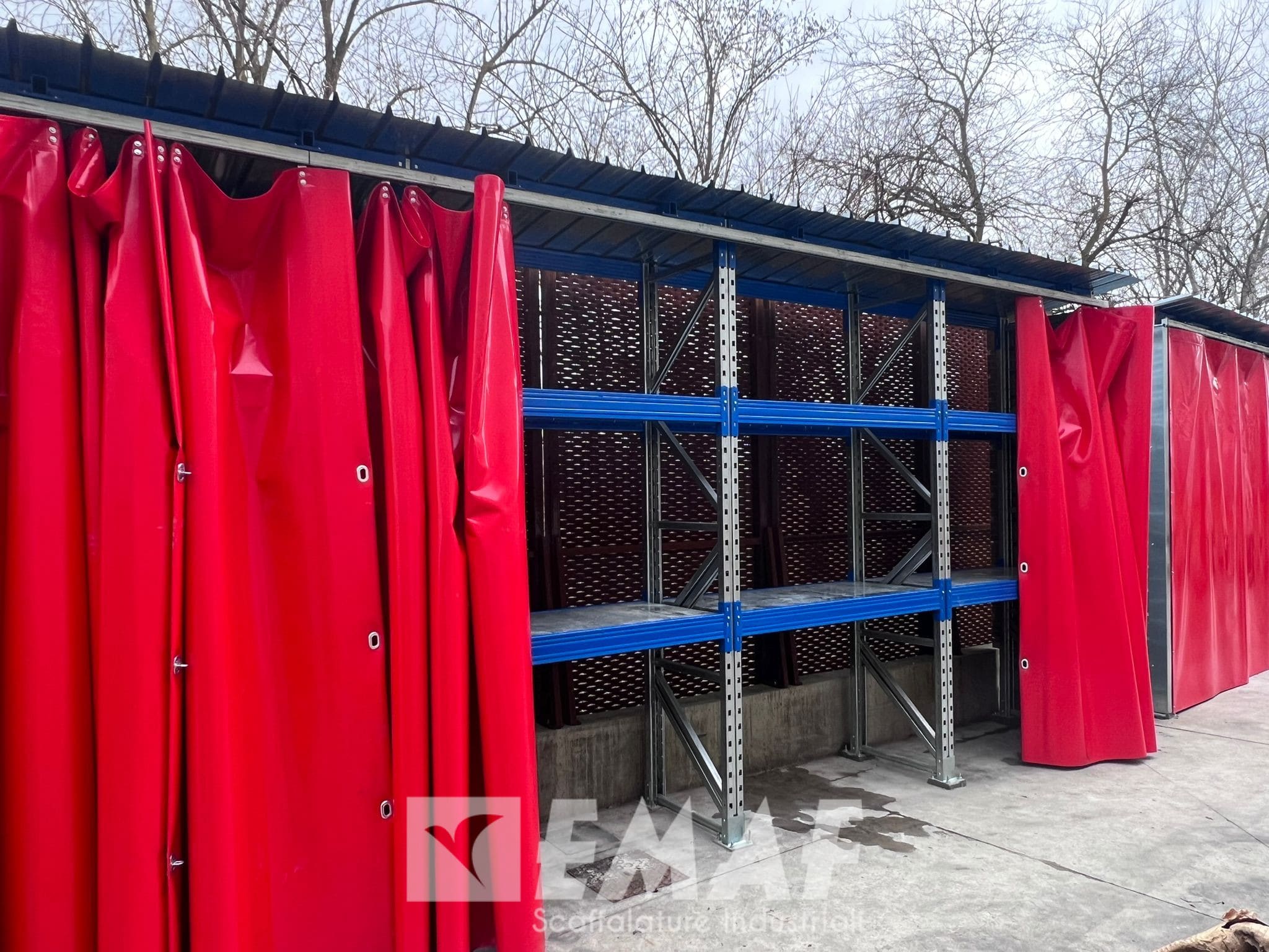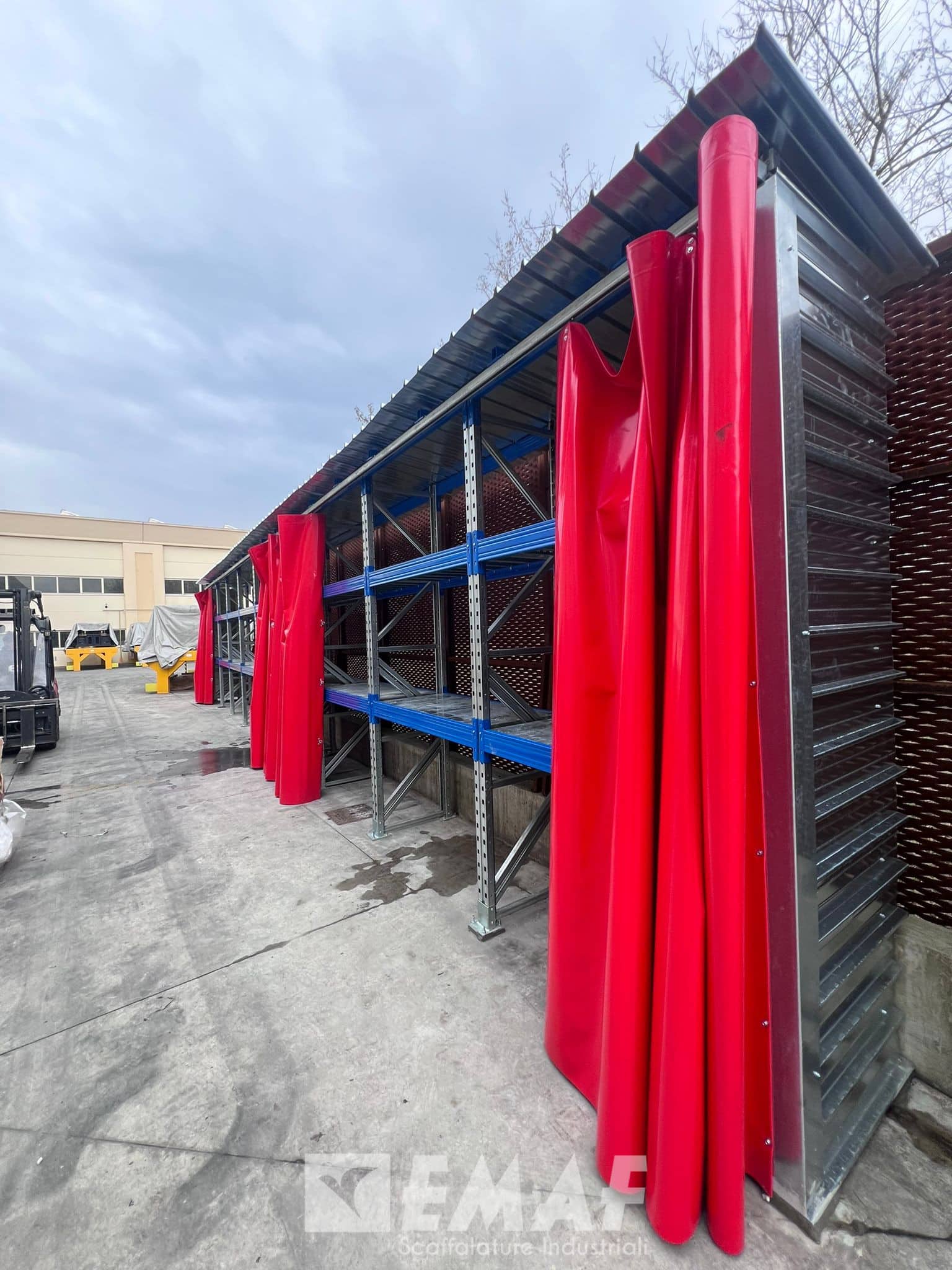 Le strutture sono state configurate con spalle in acciaio 25/10 alte 3 metri e profonde 70 centimetri, abbinate a travi di appoggio da 1,5 metri con portata di 3.000 kg a coppia. Tutti i livelli sono stati completati con doghe in grigliato metallico in sostituzione dei pianetti tradizionali, scelta tecnica che assicura maggiore robustezza, migliore resistenza nel tempo e una più efficace gestione delle condizioni atmosferiche. Poiché l’impianto è collocato all’esterno, è stata inoltre realizzata una tettoia con telone scorrevole, soluzione che protegge le unità di carico dagli agenti atmosferici e contribuisce alla conservazione dei materiali stoccati.