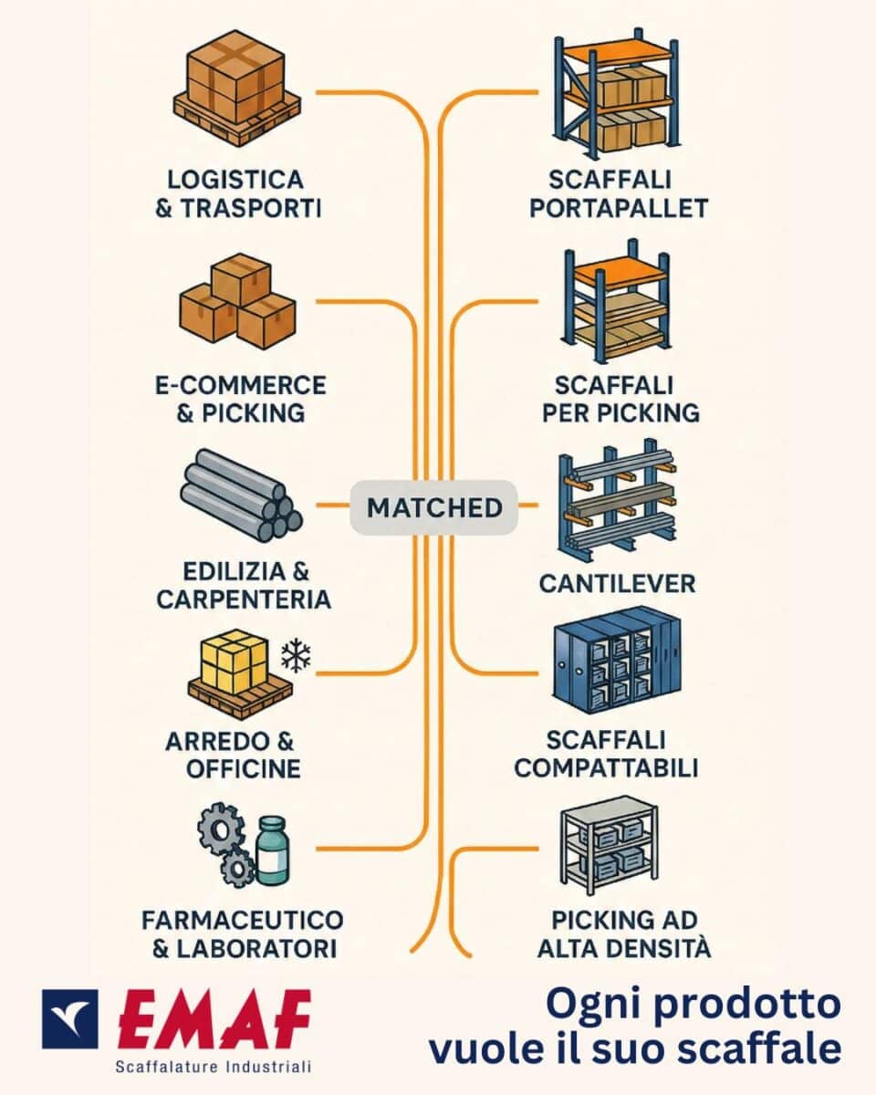 L’esperienza EMAF e le principali linee guida tecniche di settore – dalle norme UNI EN 15512, EN 15635, alle indicazioni ACAI e FEM – mostrano come ogni impianto debba essere progettato sulle reali modalità di stoccaggio, sulle caratteristiche delle unità di carico e sulle condizioni dell’edificio.