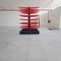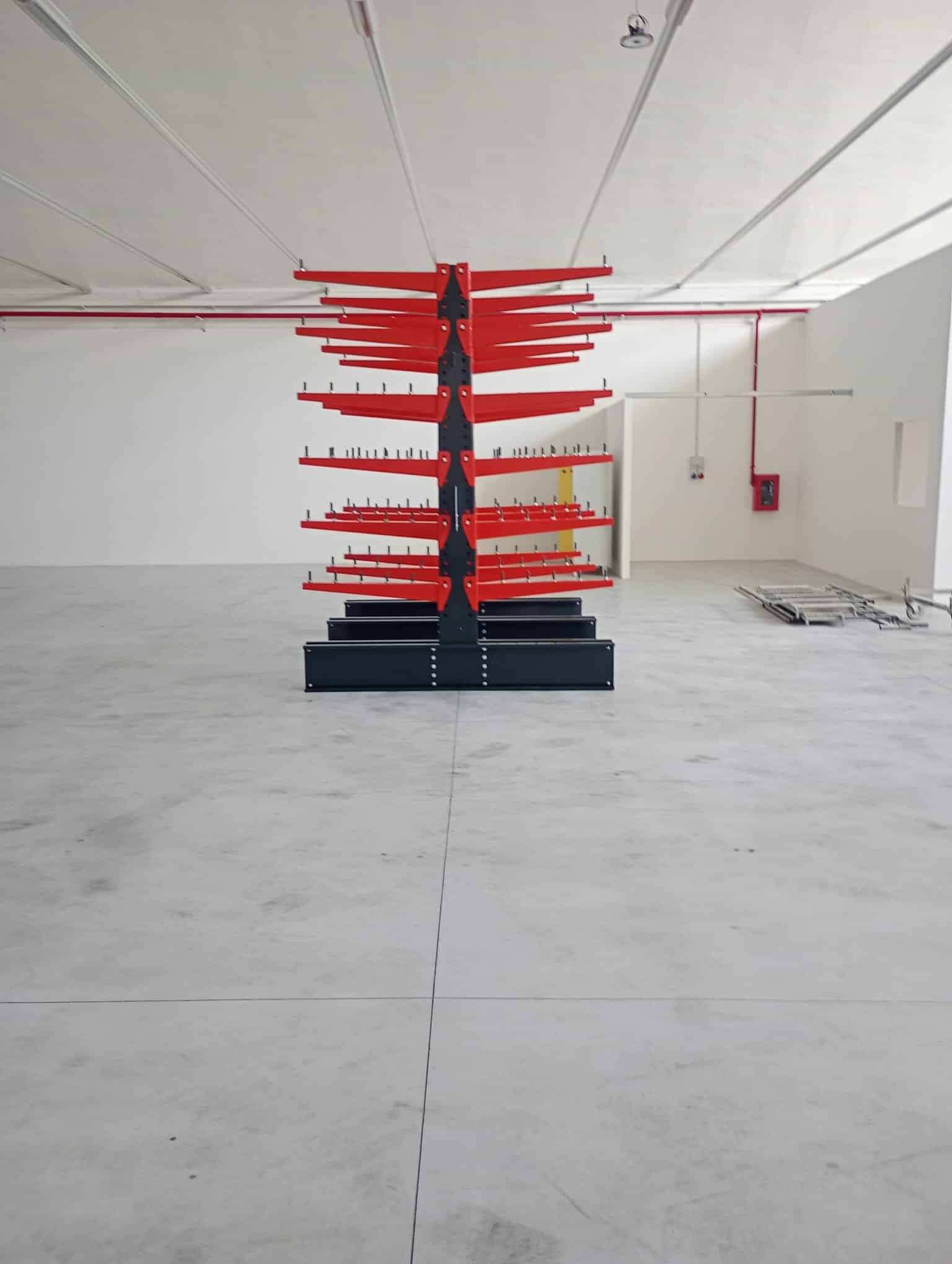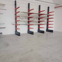 La prima struttura installata presenta un’altezza di 4 metri, una profondità di appoggio di 1 metro ed è configurata con 6 livelli di carico, ciascuno con portata di 600 kg per braccio. Lo sviluppo complessivo dell’impianto è di circa 5,5 metri lineari, garantendo una capacità di stoccaggio adeguata per materiali lunghi e di peso significativo, mantenendo al contempo ordine e accessibilità.