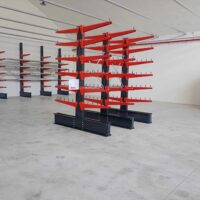 La seconda struttura è invece caratterizzata da un’altezza di 3 metri e dalla medesima profondità di 1 metro, con portata pari a 600 kg per braccio. La configurazione bifronte consente il raddoppio dei livelli di appoggio, che diventano 12 complessivi, ottimizzando in modo significativo l’utilizzo dello spazio disponibile. Su questa struttura sono stati inoltre installati bicchierini e fermi di sicurezza sulle mensole, elementi progettati per prevenire il rotolamento del materiale stoccato e incrementare il livello di sicurezza operativa.