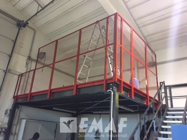 Il soppalco, sei metri per cinque con una portata di 500 kg per metro quadrato, ospiterà al piano terra parte dell’officina, che stoccherà merci e attrezzi al piano superiore.